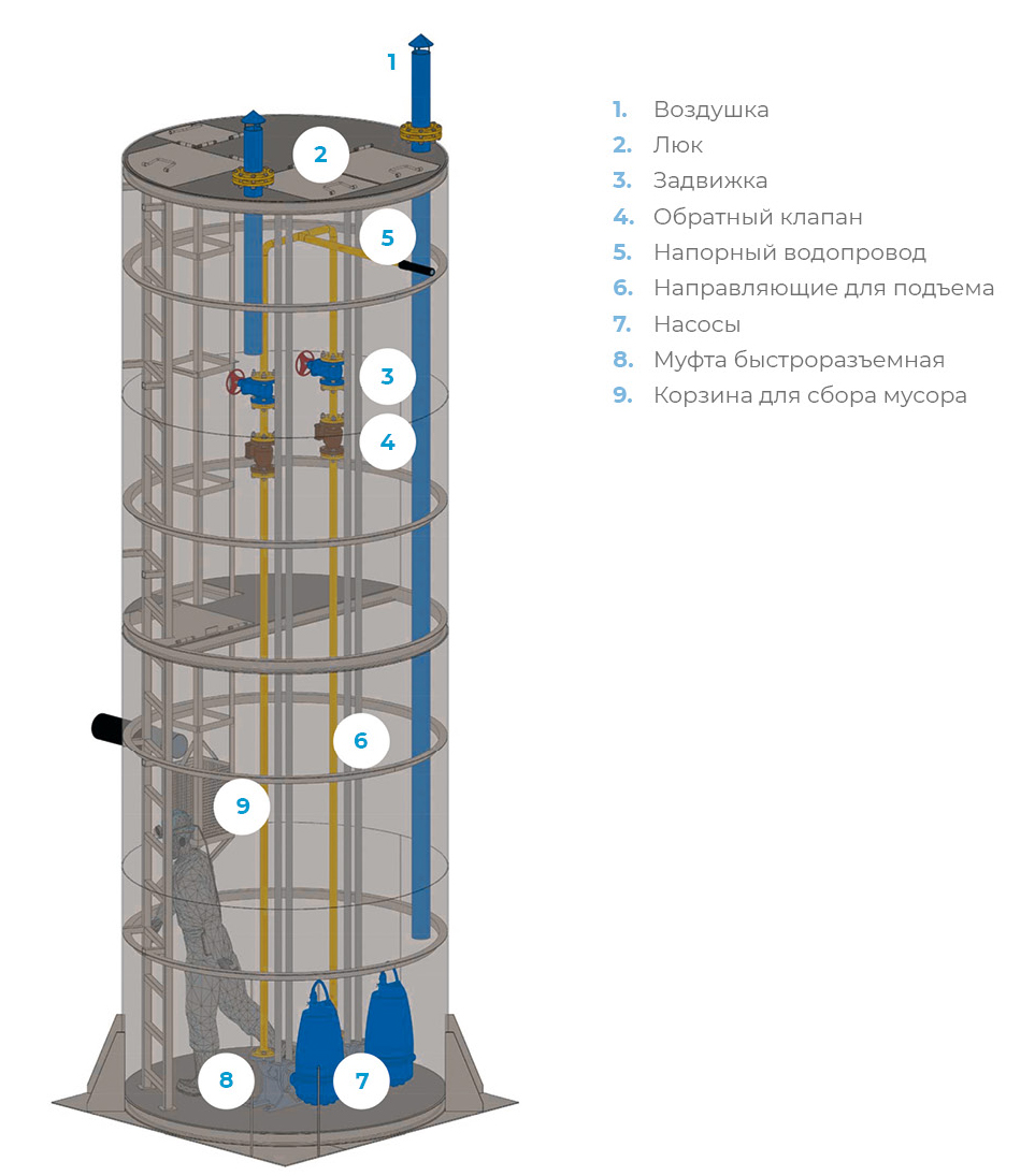 Для исключения эффекта «падающей струи» в конструкции КНС предусмотрен сливной вертикальный трубопровод.